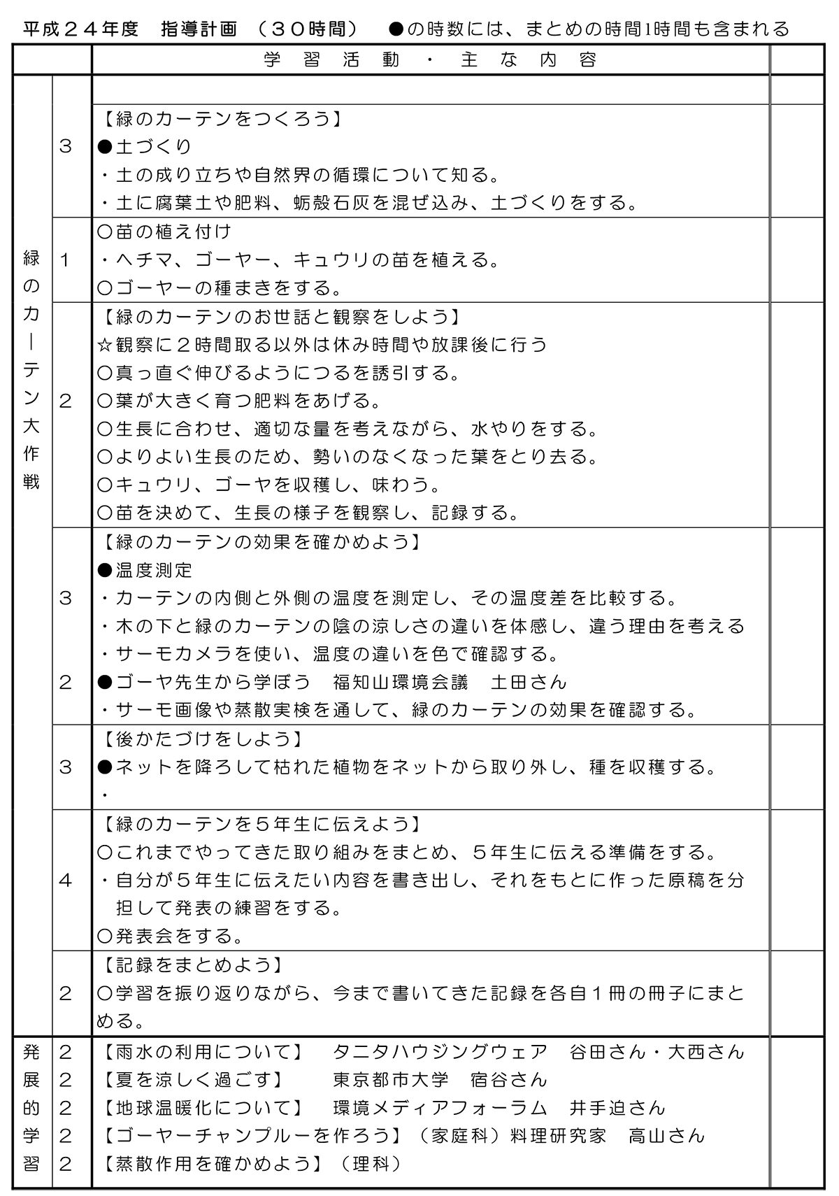 春先に、培養土と腐葉土とボカシを混ぜ合わせる土づくりから始めて、苗の植え付けや水やりなどのお世話をする一方で、できた緑のカーテンの内外で実際に温度測定をしながらその効果を実測したり、熱の伝わる仕組みについて勉強したり。地球温暖化防止と緑のカーテンとの関係についても学習する。