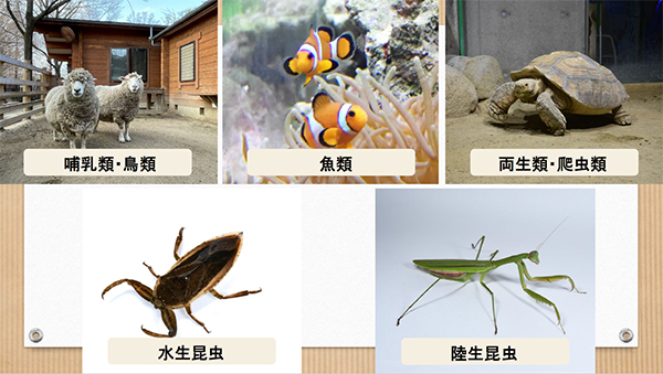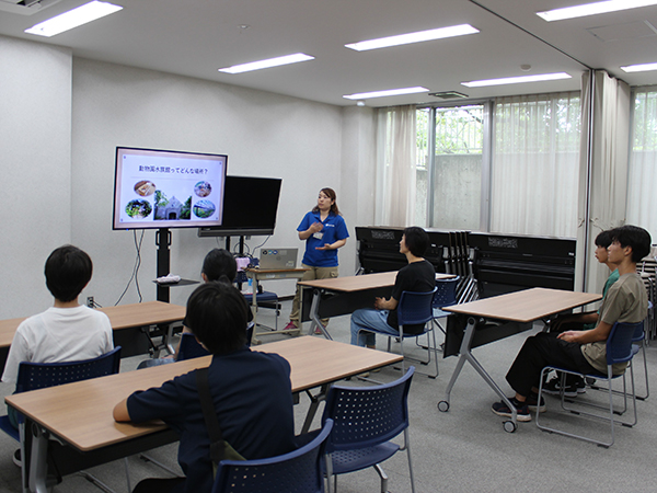レクリエーションでは、生物園をまずは楽しいと思っていただけないと来園に繋がらないので楽しんでいただけるようなイベントを実施していること、教育では、1人でも多くの方に生きものや自然に興味を持ってもらうような活動やイベントの実施をしていること、調査研究では、生きものを健康に飼育する上での情報収集や他の園館と情報交換をしていること、種の保存では、本来の生息地で生きることが厳しい生きものを飼育し、命を繋げるために繁殖に取り組んでいることなど、このような取り組みも動物園・水族館の大事な役割だと金井田さんは話します。体験した内容は4つの役割のうちどれに当たるのか、クイズ形式で改めて考えてもらい、生物園で実施している4つの役割についての理解を深めました。