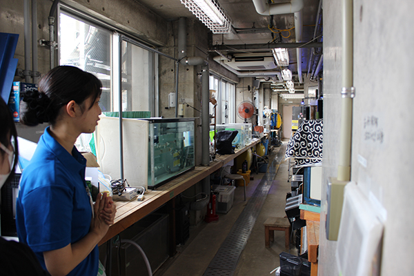 まず密着させてもらったのは、魚類コース。狭いバックヤードには精密な機械もあるので、展示水槽の裏手の通路を気をつけながら移動します。