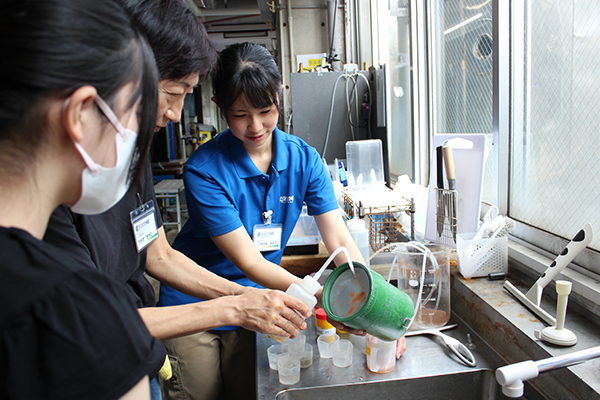 細かい網に付着したブラインシュリンプを純水(RO水)で流して救出する体験者(左)