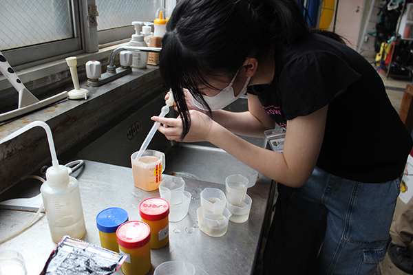 エサづくりが終わったら後片付けまでが仕事です。海水は乾くと塩が結晶として固まってしまうので、くまなく水洗いします。また、繁殖力の強いクラゲは思いもよらぬところで繁殖してしまうため、使ったスポイトなどの器具は念入りに洗います。丁寧さや整理整頓の重要性もひしひしと感じました。