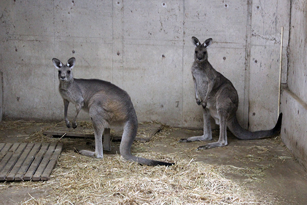 カンガルーのエサは牛などが食べる牧草を少しアレンジ。イネ科の牧草は繊維が多く低たんぱく、マメ科は高たんぱくの栄養があり、6:4の割合でバケツに分けました。