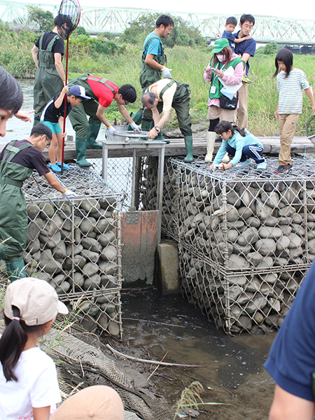 魚の追い込みは池の奥から荒川に向かって、列になって水の中の生き物を誘導していきます。池の水を止めている水門の手前に定置網を設置し、ここに向かってみんなで少しずつ進んでいきます