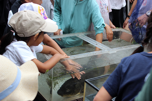 子どもたちはどきどき・わくわく、どんな生き物を救出したか、結果が気になります。定置網を引き揚げて、トロ舟(バケツ)に放つと、70センチを超える巨大なコイが姿を見せ、大歓声が上がりました。