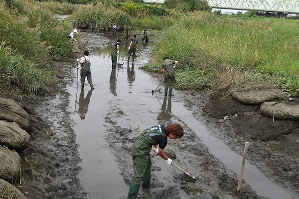 ワンドには、東京湾の潮の満ち引きの影響で一日二回、水の出入りがあり、台風などの影響も受けます。このような環境は、池の底に「ヘドロ」が発生しやすく、生き物や生態系に悪影響を与えます。そのため、市民が安全に自然の大切さを学べる場所として作られたワンドでは、2007年から毎年、池の泥のかきだしが行われています。この作業をすることで、底の土に酸素を運び、水草が生えやすい環境も作ります。