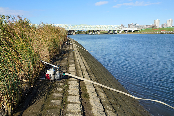 晴れたり曇ったり、天気の安定しない10月4日、埼玉県川口市と接する東京都北区の荒川沿い、「北区・子どもの水辺」に多くの人が集まってきました。テレビ番組「緊急SOS!池の水ぜんぶ抜く大作戦」で一躍有名となった「かいぼり」が、国土交通省、北区、北区水辺の会の協力で半日×4日間にわたって行われる初日です。