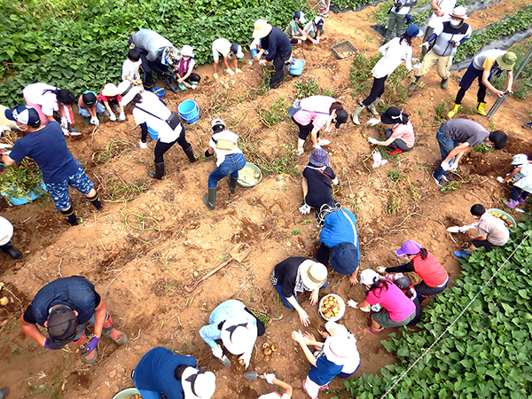 「つくし野ビオトーププロジェクト」は町田市つくし野地区の農家のご厚意で借り受けた畑や近隣で年22~24回、農業体験や環境学習の場を提供しています。専用畑での多種作物の植え付けや収穫を中心に、夏はカブトムシ相撲大会、冬は巣箱づくりや里山ハイキングなど、多様なプログラムで構成し、毎回20~100名が参加します。人気があるのは、ジャガイモ・サツマイモ掘り。基本的には世帯ごとに抽選で持ち帰ることができます。ずっしりと重さのあるイモなどを抱え、うれしそうに帰路につく姿は何気なくも幸せな光景が広がります。