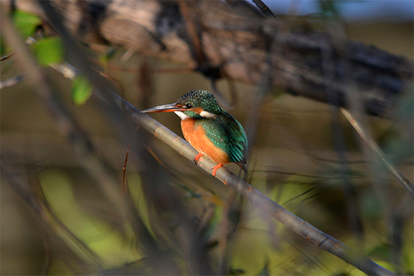 双眼鏡で覗くと確かに枝にとまる一羽。オレンジ色のお腹を水面に向けて約20分もの間、周囲をきょろきょろとする愛らしい姿を見せてくれました。