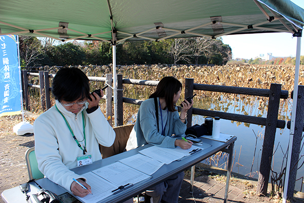 複数人での定点観測に加え、猛禽類の調査等で使用されるトランシーバー(無線機)を用いる手法を水元かわせみの里が独自に合わせました。これにより、同時確認した個体が別個体であることがわかり、またトランシーバーで個体の追跡を行うことで、正確な個体数を記録できます。