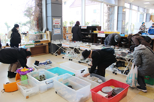 今回の目玉は、区民から集まった家具や雑貨、おもちゃ、子ども服などのリユース品の無料配布会です。通常は同プラザ内の「いたぷらショップ」で、安価にリユース品を販売していますが、この日は“無料”とあって、イベント開始の9時30分には、多くの人が列を作り、1日の来場者数は700名以上に上りました。家具やおもちゃは早々に新しい家主のもとへ旅立ち、食器、子ども服、本などの陳列場所も人だかりができ、バックヤードから品物を補充し続ける状態が続きました。