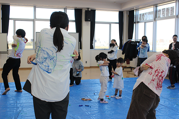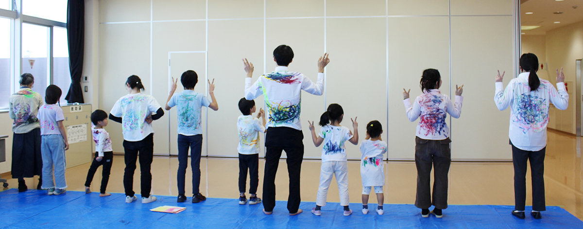 20周年を記念した特別企画では、「背中で語ろう」等のパフォーマンスで国内外で活躍されているパフォーマンスアーティストの村田峰紀さんを招き「背中に描(えが)こう」と題したアートイベントを開催しました。村田さんの作品の追体験を、リサイクルプラザならではのアップサイクル体験という形に変え、もう着ない服を自分の手で作品に昇華させました。未就学児から大人まで、幅広い年齢層が参加しました。