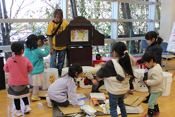 子どもたちは、ともちさんの声色とお芝居を聞いてすっかり物語の世界へ。資源やごみが様々なキャラクターとなって、分別の大切さを教えてくれます。お話の合間には分別ゲームが盛り込まれ分別が正解すると喜ぶ声、間違っていると、モンスターが嫌がる声を出す仕掛けがあり、楽しく分別を学んでいました。