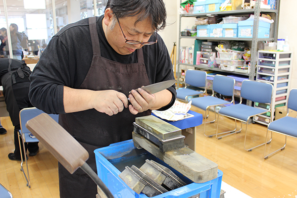 切れ味がイマイチになった包丁、ハサミなどをプロに研いでもらえる出張研ぎ工房。千葉県成田市の(有)正次郎鋏刃物工芸の六代目正次郎さんが刃物を研ぎなおしてくれます。有料ながら事前予約は定員に達し、人気の高さが伺えました。プロの手により、思い入れのある包丁が再び使えるようになり依頼された方たちは満足されていました。
