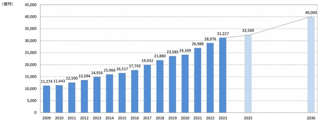 環境省によると、2023 年における、国内の消費財における販売額を示したリユース市場規模は3兆1,227億円で、2009 年の1兆1,274 億円から大幅に増加し、今後も市場規模が増加していくことが予測されています。
